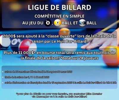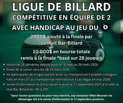 819-246-7665 billardlehuit@gmail.com Open: 7 days - 8:00 am-3:00 am Pool rates 8 am-5 pm: $7.50 for the day - Free with purchase of 1 alcoholic beverage/person 5 pm-3 am: $7.50/hour/person - Free with purchase of 1 alcoholic beverage/hour/person
